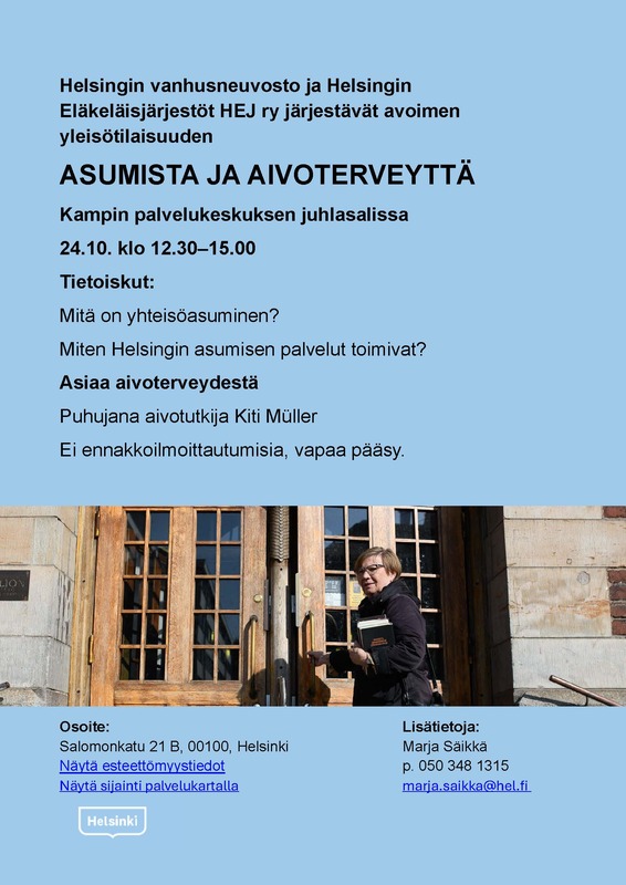 Helsingin vanhusneuvosto ja Helsingin Eläkeläisjärjestöt HEJ ry järjestävät avoimen yleisötilaisuuden asumisesta ja aivoterveydestä Kampin palvelukeskuksen juhlasalissa, klo 12.30-15:00, osoite Salomonkatu 21 B, 00100, Helsinki. Liitteet
